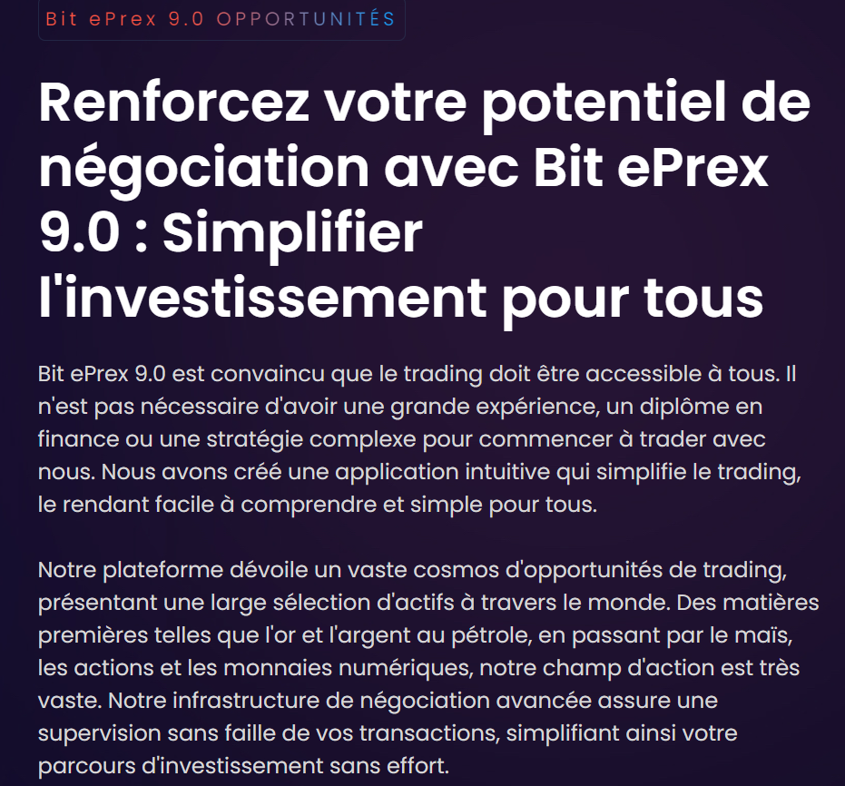 Une nouvelle plateforme de trading en cryptomonnaies qui soulève de sérieuses inquiétudes : Bit ePrex 9.0. Cette plateforme présente des signes clairs d’une arnaque bien ficelée, destinée à tromper les investisseurs. Décortiquons les éléments qui révèlent la supercherie.